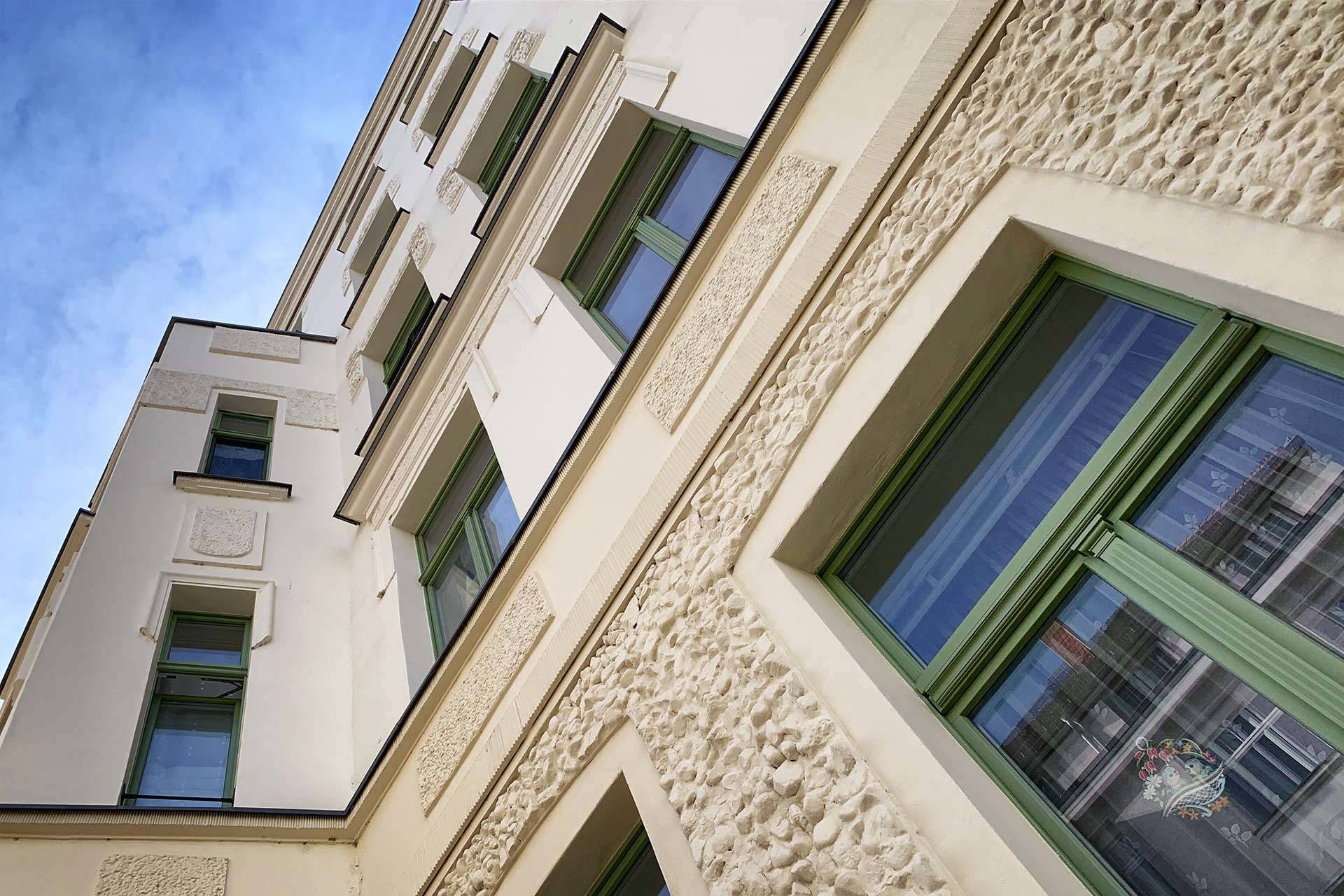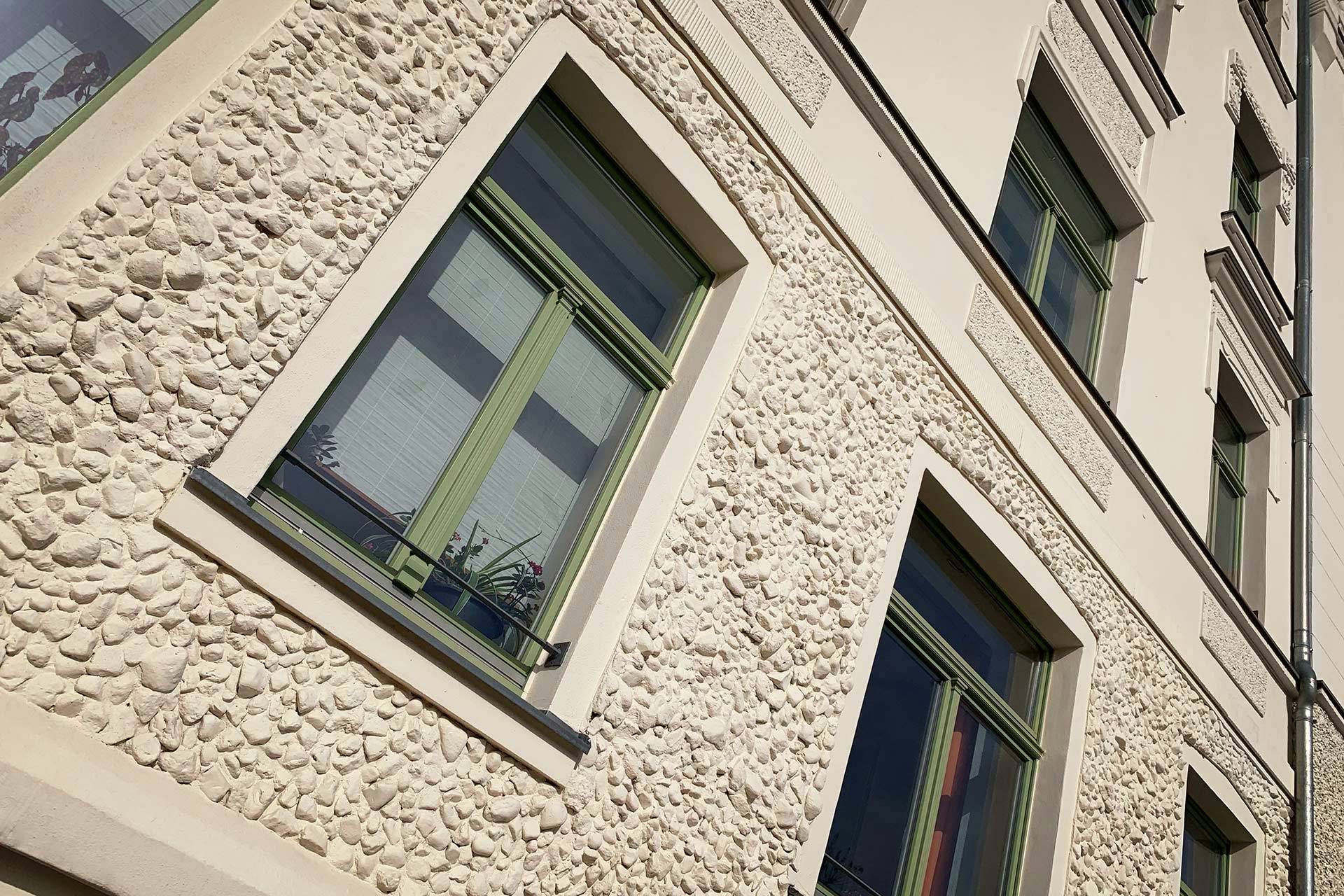Das imposante Gründerzeit-Mehrfamilienhaus aus dem Jahr 1903 nutzt auf seiner Außenfassade verschiedene Putzarten, z.B. Kellenwurfputz und Feinfilzputz. Im Erdgeschoss wurden besonders aufwändig bis zu 10 cm große Steinknopen in den noch feuchten Putz eingearbeitet.